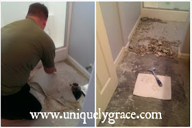 STEP 1: Tear up existing flooring. We had linoleum on concrete sub floors. To tear up the linoleum was nothing hard. Just grab and pull up. However, there was a sticky glue backing that was difficult and took some elbow grease to work through but it was not to bad with the proper tools. Get one of these hand held cement floor scrapers (found in the paint department). Make the floors smooth and patch any concrete that is cracked, low or chipped (you will find more chipping in areas with carpet on top of concrete from the tack strips). Let any patching dry allotted time on package and then sweep and clean the floor.
